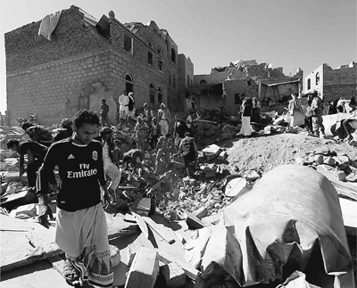 沙特阿拉伯等國戰(zhàn)機(jī)5月1日凌晨空襲也門首都薩那,一處平民區(qū)被炸。圖為人們清理空襲后的廢墟。