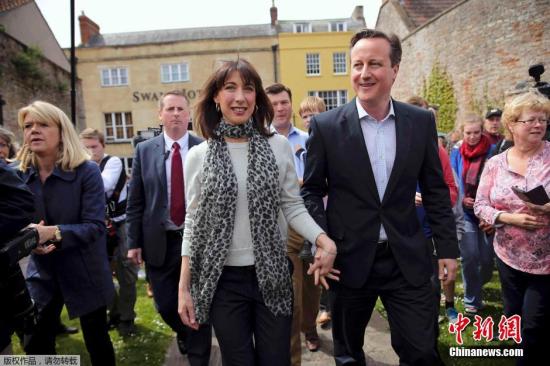 資料圖:當(dāng)?shù)貢r間2015年5月4日,英國保守黨領(lǐng)袖、英國首相卡梅倫攜妻前往英格蘭,為選舉拉票。