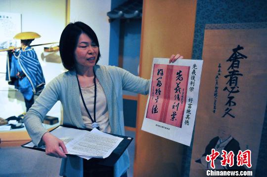 圖為近江商人博物館講解員展示各色“家訓”復制品。 王健 攝