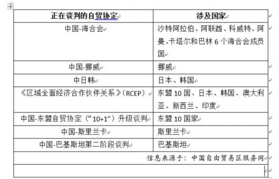 “中國(guó)對(duì)外商談自由貿(mào)易協(xié)定總體情況”還顯示,我國(guó)正在談判的自貿(mào)協(xié)定7個(gè),涉及22個(gè)國(guó)家,分別是中國(guó)與海灣合作委員會(huì)(GCC)、澳大利亞、斯里蘭卡和挪威的自貿(mào)協(xié)定,以及中日韓自貿(mào)協(xié)定、《區(qū)域全面經(jīng)濟(jì)合作伙伴關(guān)系》(RCEP)協(xié)定和中國(guó)-東盟自貿(mào)協(xié)定(“10+1”)升級(jí)談判、中國(guó)-巴基斯坦自貿(mào)協(xié)定第二階段談判。