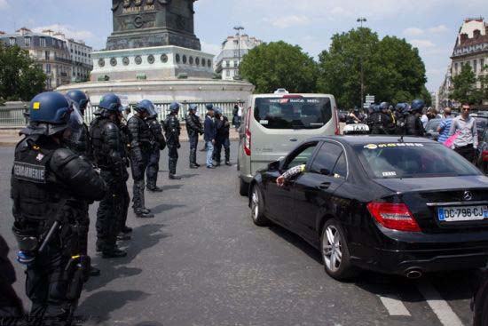 法國巴黎的出租車司機與優(yōu)步(Uber)專車司機16日發(fā)生沖突,出租車司機向?qū)\囃稊S石塊,最后防暴警察出動才得以制止事端。