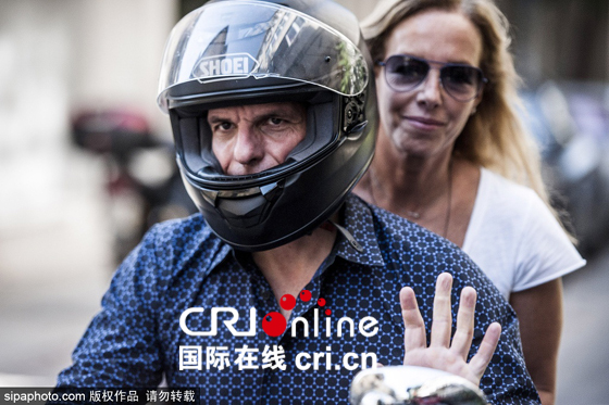 希臘財(cái)長(zhǎng)瓦魯法基斯騎摩托車載著妻子離開財(cái)政部。