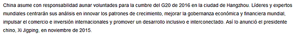 2015年11月,中國(guó)國(guó)家主席習(xí)近平宣布,中國(guó)將萬眾一心、負(fù)責(zé)任地舉辦2016年G20杭州峰會(huì)。屆時(shí),各國(guó)領(lǐng)導(dǎo)人和專家將共同為如何創(chuàng)新增長(zhǎng)方式、改善全球經(jīng)濟(jì)金融治理、推動(dòng)國(guó)際貿(mào)易和投資以及促進(jìn)包容和聯(lián)動(dòng)式發(fā)展建言獻(xiàn)策。
