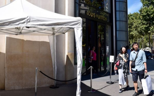 資料圖:法國巴黎,兩名游客走過香榭麗舍大街上的路易威登旗艦店。 (新華社記者李根興 攝)