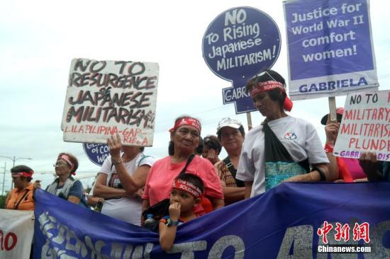 1月12日,菲律賓多個民間團體在日本駐菲大使館前舉行集會抗議活動,要求日本政府向慰安婦受害者正式道歉、賠償。圖為參加集會抗議的人群。1月12日至13日,日本首相安倍晉三對菲律賓進行正式訪問。中新社記者 張明 攝