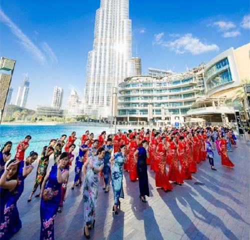 2017年1月15日,身著旗袍的快閃活動(dòng)參與者在阿聯(lián)酋迪拜世界最高建筑——哈利法塔腳下表演。(新華社資料圖)
