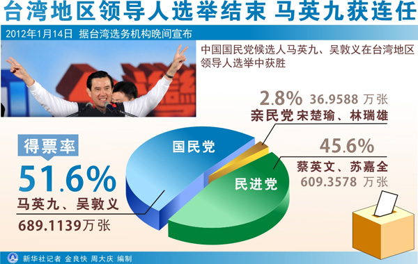 2012年1月14日 圖表:臺灣地區(qū)領(lǐng)導(dǎo)人選舉結(jié)束 馬英九獲連任 新華社記者 金良快 周大慶 編制