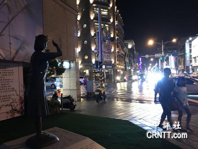 左面為夜幕中的慰安婦銅像,對面即是“日據(jù)”時期的日本百貨。(圖片來源:香港中評社)