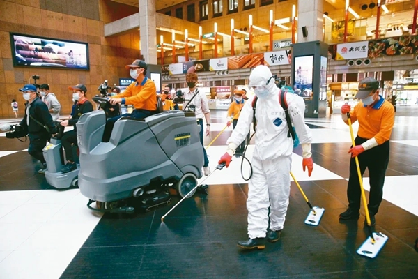 臺軍磐石艦染疫,確診者足跡包含臺北車站等交通要點(diǎn),圖為臺鐵在清潔消毒。(圖片來源:臺灣《聯(lián)合報(bào)》)