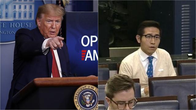 臺(tái)籍上海東方衛(wèi)視駐白宮記者張經(jīng)義早前在美國(guó)總統(tǒng)特朗普的記者會(huì)上提問(wèn)。(圖片來(lái)源網(wǎng)絡(luò))