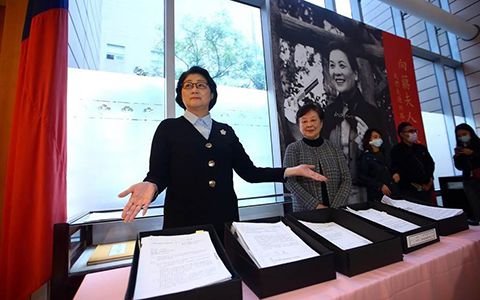 “婦聯(lián)會”主委雷倩(左)舉行記者會指出,“婦聯(lián)會”受到民進(jìn)黨當(dāng)局各部門聯(lián)手夾殺,并展示與各單位間的往來公文。(圖片來源:臺媒)