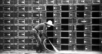 4月8日,一名工作人員在香港九龍長(zhǎng)沙灣家禽批發(fā)市場(chǎng)清潔雞籠。新華社記者 呂小煒攝
