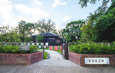 于是,我們來到了舊城南路。叢林掩映中,隱約可見一處所。循著細碎的白色鵝卵石慢慢走,鉛紅色的磚砌矮墻上懸掛匾牌說明來處——舊宜蘭農(nóng)林學(xué)校校長官舍。踏入庭院,別有洞天;浞泵,綠草茵茵,蜿蜒小路延伸到一處日式的老建筑,上書——宜蘭文學(xué)館。