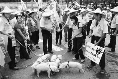 臺灣豬農(nóng)曾多次“擊退”過美國豬肉的進(jìn)口,這是2007年的抗議場景。(資料圖片)