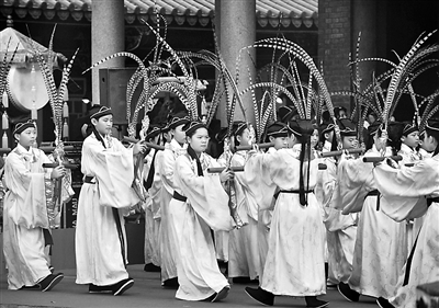 9月28日是孔子誕辰紀(jì)念日,也是臺灣的教師節(jié),每年臺北孔廟依循古禮舉行祭孔儀式。圖為祭孔儀式上,佾生表演八佾舞。新華社記者 魯鵬攝
