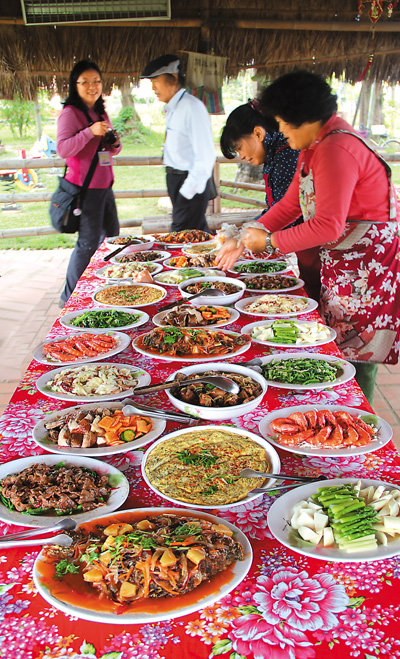 農(nóng)忙時(shí)節(jié)農(nóng)家在地頭吃的“割稻飯”,用的都是當(dāng)?shù)禺?dāng)季作物,近幾年大受城市游客歡迎。圖為臺(tái)南后壁鄉(xiāng)田間為迎接游客準(zhǔn)備的“割稻飯”。