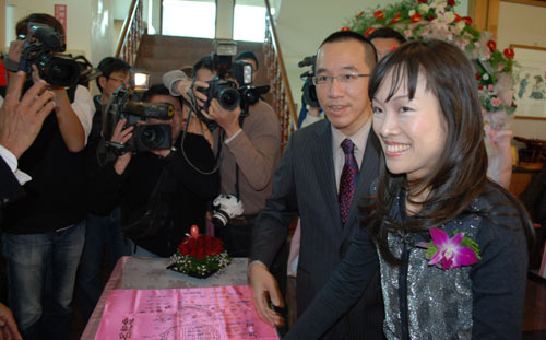陳水扁兒子陳致中(右2)和妻子黃睿靚(右1)出席妻舅黃漢強(qiáng)的婚禮。圖片來源:臺(tái)灣“中央社”