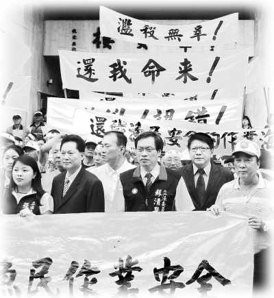 臺(tái)灣漁會(huì)13日組織抗議活動(dòng)表達(dá)漁民之怒,從各地抵達(dá)臺(tái)北的近400位漁民頭綁“抗議”布條,打出“還我命來(lái)”、“流氓行為”、“濫殺無(wú)辜”的標(biāo)語(yǔ)。被射殺的漁民洪石成所在的屏東縣琉球鄉(xiāng)鄉(xiāng)長(zhǎng)和30多名鄉(xiāng)親走在抗議人群中,代替正在料理后事不能北上的洪石成的家屬聲討菲律賓公務(wù)船的暴行。