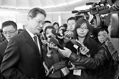 論壇上,國(guó)臺(tái)辦主任張志軍被兩岸記者包圍。中新社發(fā)