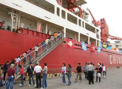 大陸破冰船“雪龍?zhí)枴?月1日停靠高雄港。圖為民眾參觀場景。