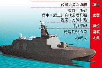 對(duì)于研發(fā)新型近岸巡邏艦,海軍司令部表示,海軍希望建立“不對(duì)稱戰(zhàn)力”,因此一直朝小而精、小而巧、小而強(qiáng)的方式,籌建現(xiàn)代化防務(wù)武力,以滿足臺(tái)澎防衛(wèi)作戰(zhàn)的需求。