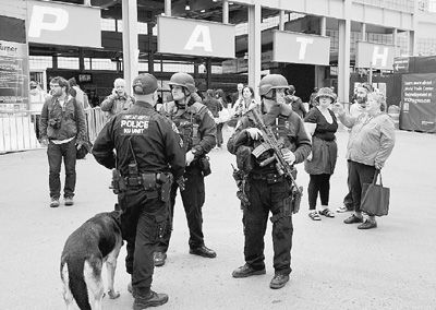 五月二日,警察在美國紐約世貿(mào)中心舊址附近的地鐵車站入口巡邏。