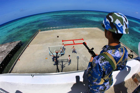 南沙衛(wèi)士在礁盤上打籃球。新華社記者 查春明攝 資料圖片