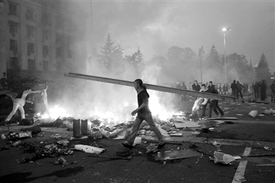圖為5月2日,在烏克蘭南部城市敖德薩,工會大樓附近的一個臨時帳篷被燒毀。烏克蘭南部黑海沿岸城市敖德薩2日發(fā)生親政府與反政府兩派民眾沖突,導(dǎo)致43人死亡。新華社發(fā)