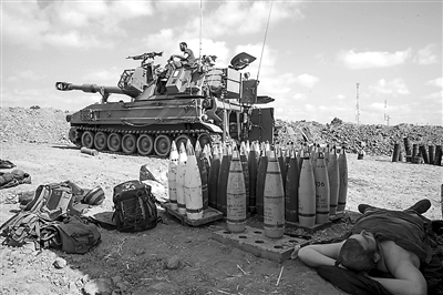 7月13日,在以色列南部與加沙的邊境,一名以軍士兵在一門自行榴彈炮旁午休。新華社發(fā)