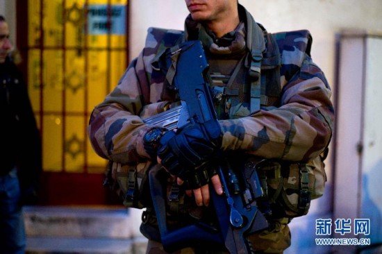 1月21日,在法國首都巴黎城外的一個猶太教堂前,一名法軍士兵持槍警戒。法國巴黎《沙爾利周刊》雜志社1月7日遭恐怖襲擊后,法國政府立即加大安保工作力度。襲擊發(fā)生的當天下午,法國總理府宣布,將首都所在的整個巴黎大區(qū)反恐預警方案“警惕海盜計劃”的警戒級別提至最高,并進一步加強對新聞機構、大型商場、交通系統(tǒng)和宗教場所的保護。法國反恐預警方案“警惕海盜計劃”的安全警戒級別有4級,政府總理有權根據實際情況和需要宣布或調整國家所處的警戒級別。目前,在法國全境執(zhí)行國內安全任務的軍人已增加到1萬人以上,其中大約8000人執(zhí)行“警惕海盜計劃”。機場、車站和著名旅游景點等重要公共場所都加強了軍人值勤的部署力度。這是法國首次在本土動員如此多的軍人參與安保。新華社發(fā)