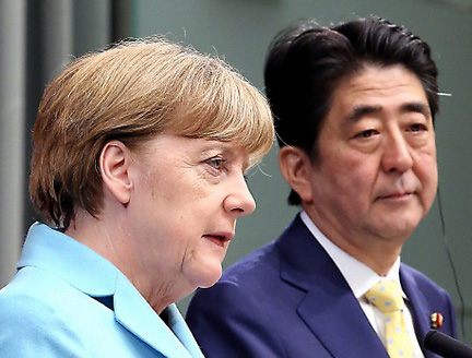 資料圖:日本首相安倍晉三與德國(guó)總理默克爾(左)。
