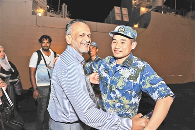 臨沂艦于當(dāng)?shù)貢r(shí)間7日凌晨1時(shí)41分安全順利抵達(dá)吉布提港。圖為海軍官兵與撤離的斯里蘭卡公民擁抱告別。熊利兵攝