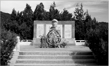 在紀念館上方的碑地入口處有一座牌樓,上面所刻的“白乙化烈士千古”正是原八路軍冀熱察挺進軍司令員蕭克的手筆。穿過牌樓,一條石板鋪成的甬道直抵山頂。莊嚴肅穆的白乙化烈士紀念碑就矗立在這巍峨的山頂上。5米見方的碑座由花崗巖條石砌成,上有漢白玉圍欄,四周栽植的柏樹茂密挺拔,上面系著前來憑吊者帶來的小白花。