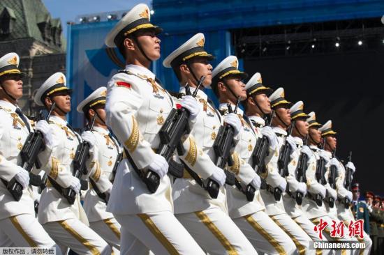 5月7日,在俄羅斯首都莫斯科,中國人民解放軍三軍儀仗隊在彩排中列隊行進。當日,俄羅斯在首都莫斯科的紅場舉行紀念衛(wèi)國戰(zhàn)爭勝利70周年紅場閱兵式總彩排。