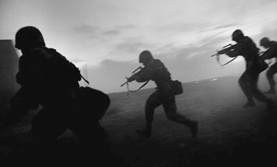 參加演習(xí)官兵驅(qū)逐趁暮色來襲之?dāng)。程成攝