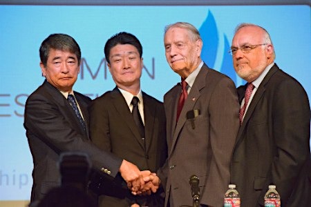 圖為三菱公司兩名高層(左側兩人)與二戰(zhàn)美國士兵握手。(資料圖)
