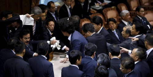 17日,日本執(zhí)政黨與在野黨就參院和平安全法制特別委員會上表決安保法一事展開激烈交鋒。