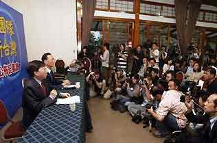 劉兆玄(左前一)周一召開(kāi)臺(tái)灣新當(dāng)局“內(nèi)閣”人事公布記者會(huì),公布首波“閣員”名單共17人。(臺(tái)灣東森新聞圖片)