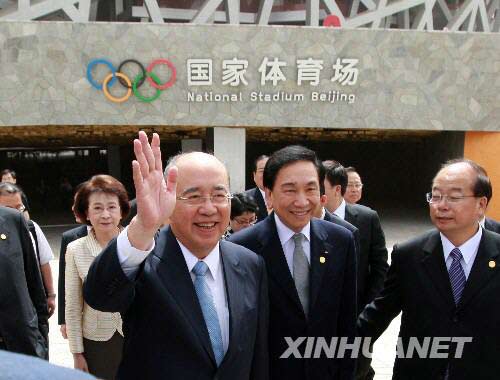 5月28日,中國國民黨主席吳伯雄率領中國國民黨大陸訪問團在北京參觀北京奧運會主體育場――“鳥巢”。 新華社記者 龐興雷 攝
