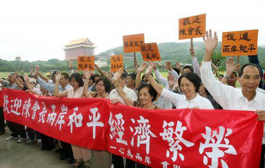 臺(tái)灣的民間團(tuán)體“中華兩岸事務(wù)交流協(xié)會(huì)”發(fā)動(dòng)支持者到陳云林下榻的圓山飯店下方河濱公園,舉布條歡迎。圖片來(lái)源:臺(tái)灣“中央社”