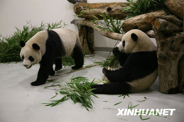 12月23日,團團、圓圓正在進食,這是它們抵達臺灣以后的第一頓正餐,食用的是隨機運抵的四川竹子,還有園方精心準備的臺灣產(chǎn)桂竹、蘋果、窩窩頭等。(圖片來源:新華網(wǎng))