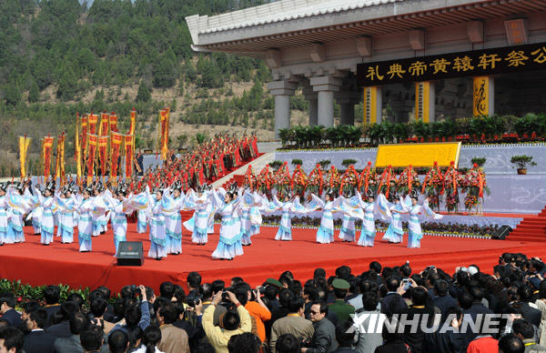 2009年4月4日,陜西省在黃陵縣橋山祭祀大院舉行“己丑年清明公祭軒轅黃帝典禮”,來自全國各地及港、澳、臺、海外同胞萬余名炎黃子孫匯聚橋山,祭奠共同的人文初祖黃帝。圖為演職人員在軒轅殿前廣場敬獻舞蹈。(來源:新華社)