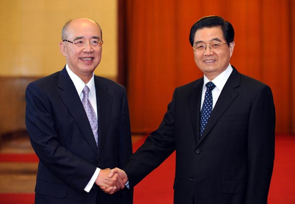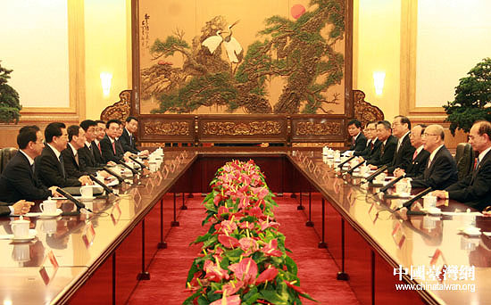 中共中央總書記胡錦濤26日下午在人民大會堂會見中國國民黨主席吳伯雄和他率領(lǐng)的國民黨大陸訪問團(tuán)全體成員,并同吳伯雄舉行會談。雙方除商談最近兩岸最熱門的“經(jīng)濟(jì)合作架構(gòu)協(xié)議”(ECFA)議題外,也就國共兩黨領(lǐng)導(dǎo)人會面建立機(jī)制以及第五屆“兩岸經(jīng)貿(mào)文化論壇”的具體內(nèi)容交換意見。