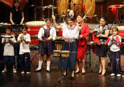 周美青(中)5月29日(當(dāng)?shù)貢r(shí)間)在危地馬拉國(guó)家劇院,換上當(dāng)?shù)貍鹘y(tǒng)婦女服裝與小朋友同樂。(圖片來源:臺(tái)“中央社”)