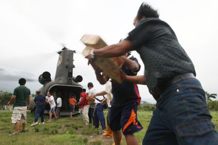 莫拉克臺風(fēng)引發(fā)大水重創(chuàng)南臺灣,臺軍“空特部”13日運(yùn)送300架次物資至災(zāi)區(qū),圖為寶來村民接力遞送空投物資。