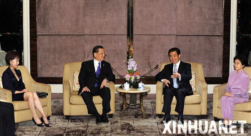 11月14日,中共中央總書記胡錦濤和夫人劉永清在新加坡會見中國國民黨榮譽主席連戰(zhàn)和夫人連方瑀。(圖片來源:新華社)