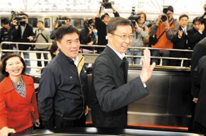 4月7日,率團(tuán)到臺(tái)北訪問的上海市長韓正在臺(tái)北市長郝龍斌(左二)的陪同下搭乘臺(tái)北捷運(yùn)淡水線。圖為韓正向搭乘捷運(yùn)的臺(tái)北市民揮手致意。