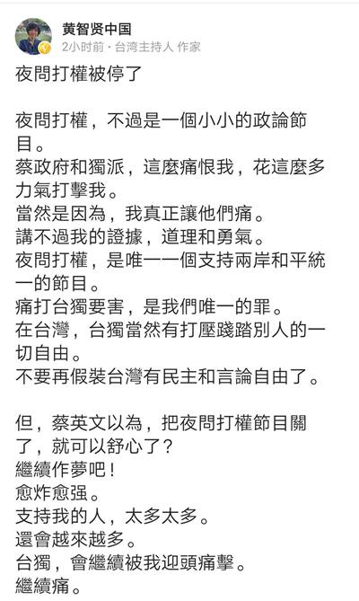 黃智賢節(jié)目遭停播:只許“臺獨(dú)”放火,不許“統(tǒng)派”點(diǎn)燈?