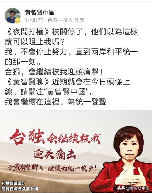 6月27日下午,黃智賢繼續(xù)在網(wǎng)絡(luò)平臺發(fā)文,宣布新節(jié)目《黃智賢聊》近期將會上線,她會繼續(xù)為統(tǒng)一發(fā)聲。黃智賢還表示:蔡英文以為把《夜問打權(quán)》關(guān)了就可以阻止我嗎?支持我的人太多太多,還會越來越多,我不會停止努力,直到兩岸和平統(tǒng)一的那一刻,“臺獨(dú)”會繼續(xù)被我迎頭痛擊!
