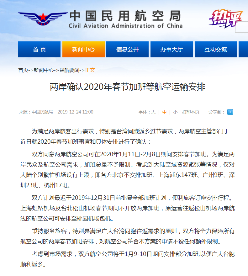 臺(tái)灣同胞爭取了很久的春節(jié)加班機(jī)一事,終于得到了臺(tái)灣方面的同意。據(jù)中國民航局網(wǎng)站消息:兩岸航空主管部門于近日就2020年春節(jié)加班事宜和具體安排進(jìn)行了回應(yīng),雙方同意兩岸航空公司可在2020年1月11日至2月8日期間安排春節(jié)加班,而且加班總量不予限制。
